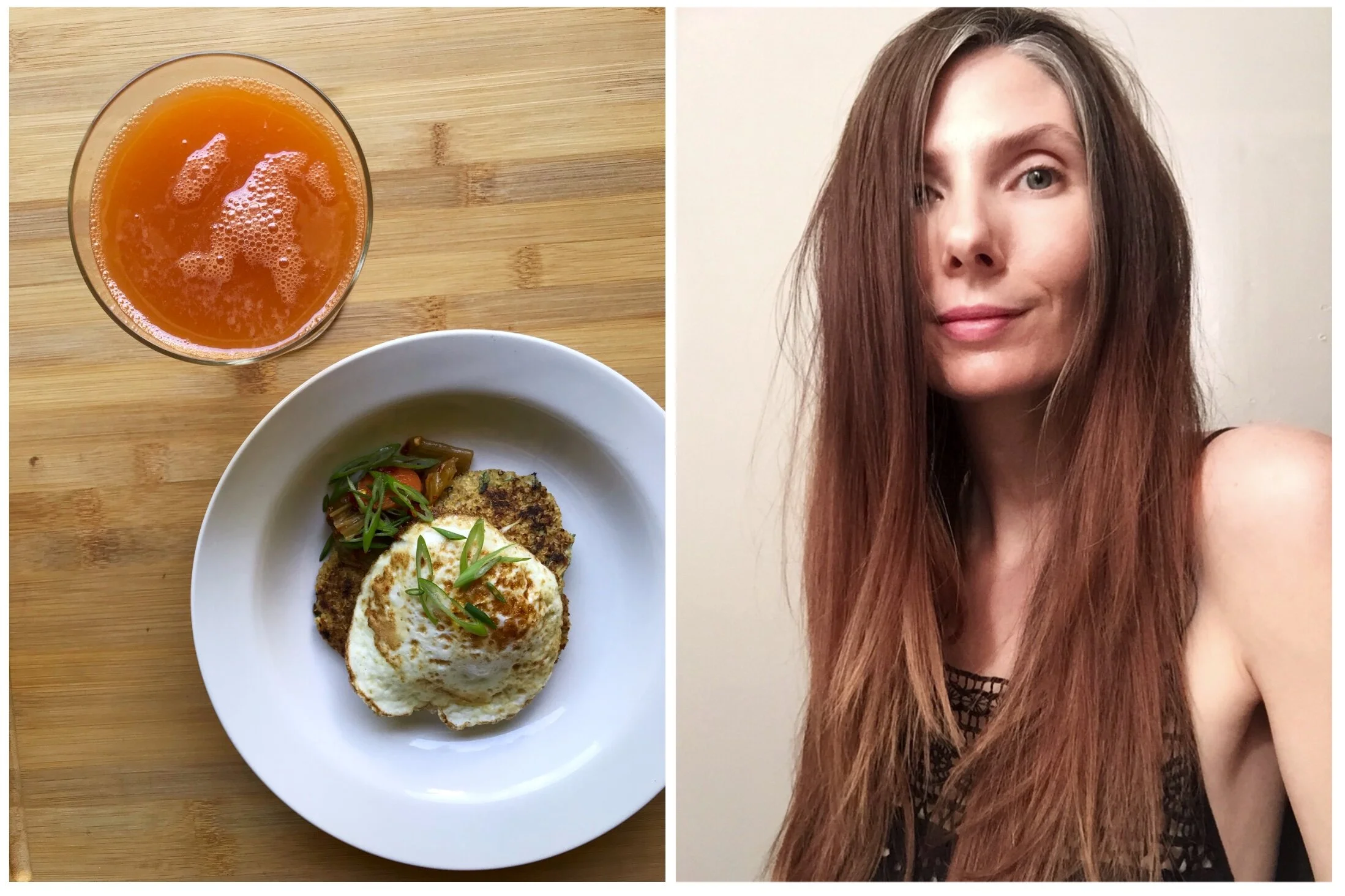 Day 92: Kimchi quinoa cakes with & a fried egg with a little mocktail of carrot juice, kombucha and Honeysuckle flower essence. The kimchi is from Eden East. That shit lit me up! It is very good and pretty spicy, for me anyway.