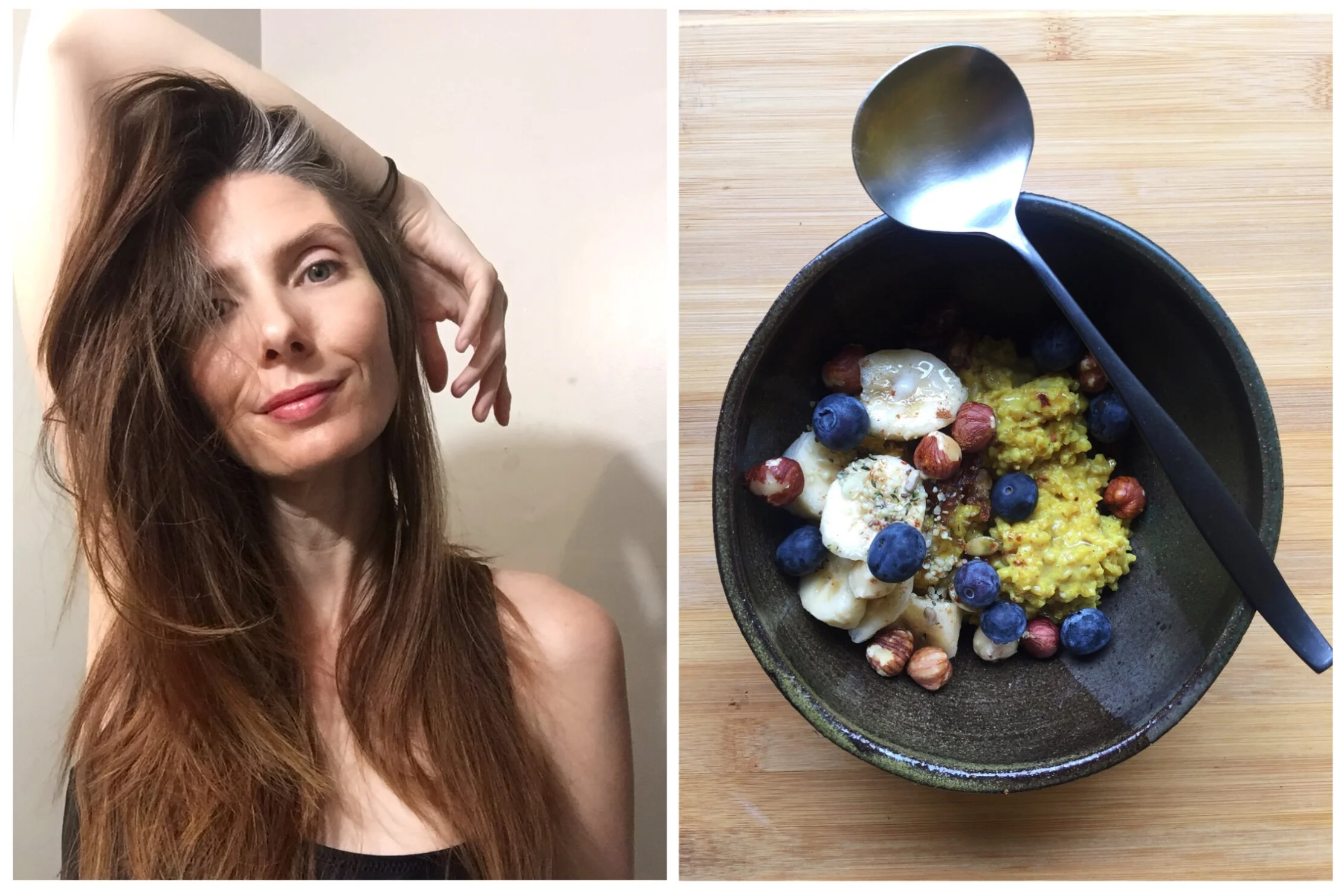 Day 127: Golden Milk oatmeal with bananas, hazelnuts, bloobs, cinnamon, seeds and coconut butter.